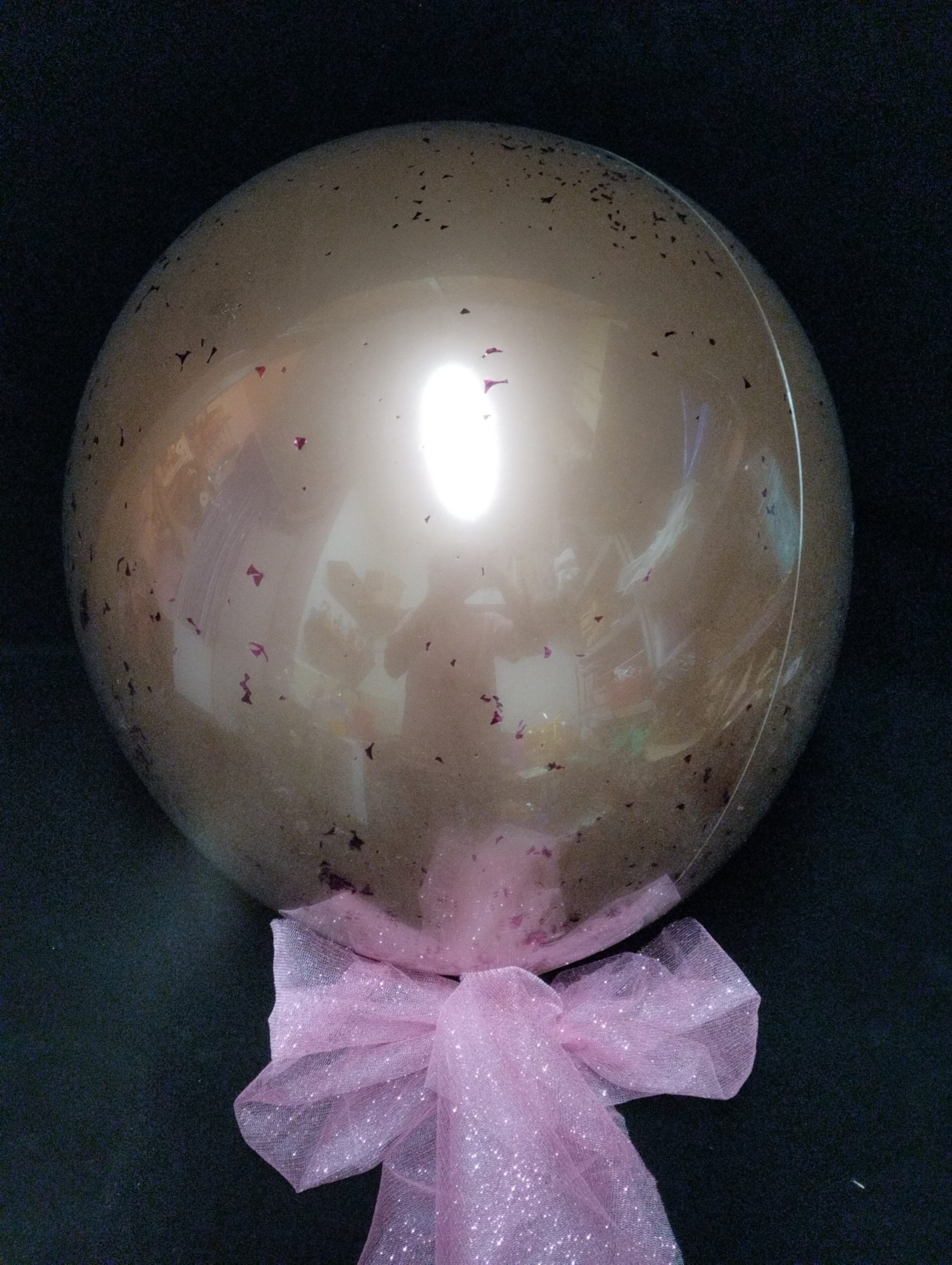 Globo decorado con variedad de brillantinas y fondeado con globo metálico.